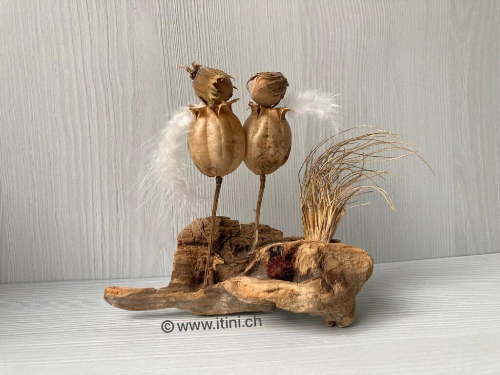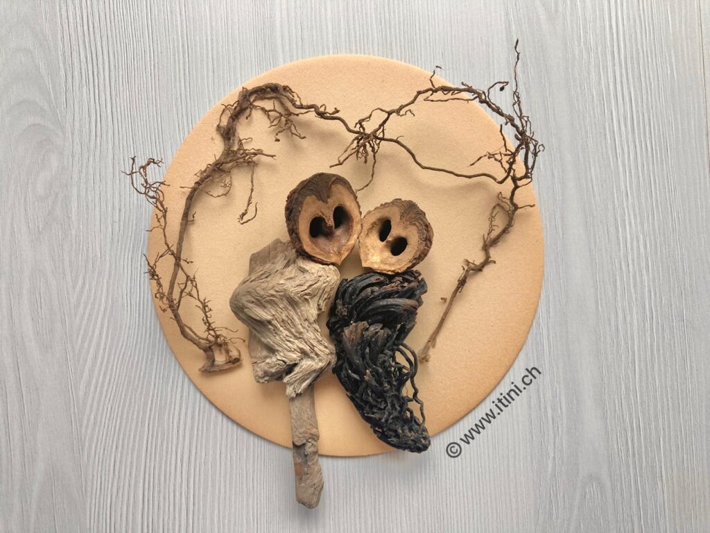 Holzgegenstände kunstvoll mit Briefmarken beklebt